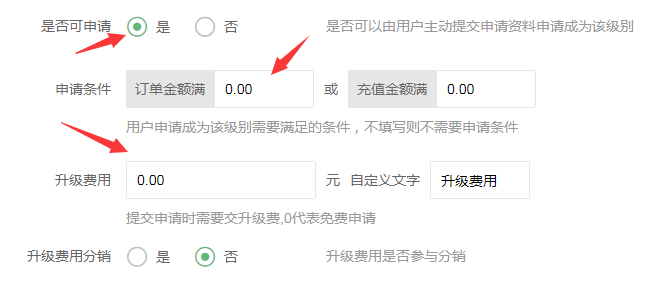 編輯分銷會員,這里就是申請升級的條件,可以滿多少金額,或者直接收費升級