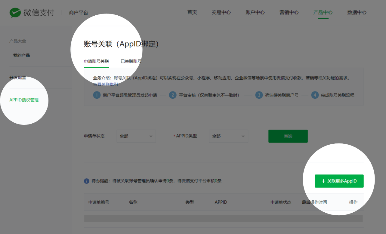 1. 登錄商戶平臺-產(chǎn)品中心-賬號關(guān)聯(lián)(AppID綁定),進(jìn)入授權(quán)申請頁面;