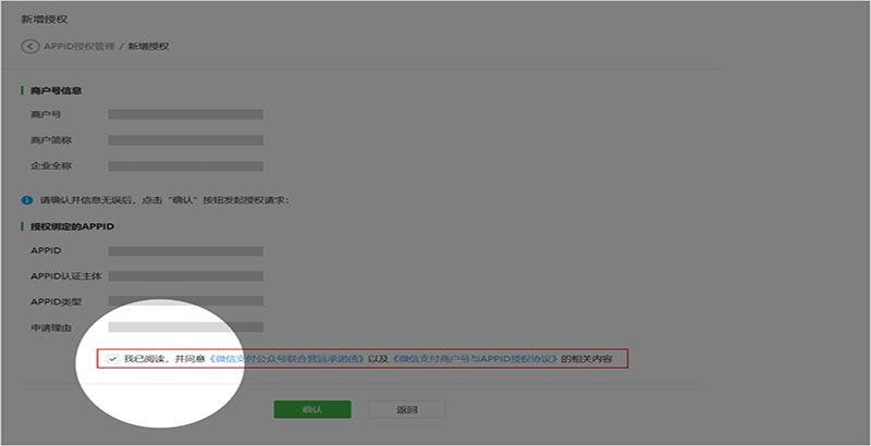 2. 填寫相關(guān)已認(rèn)證APPID信息,閱讀并簽署《微信支付商戶號與APPID授權(quán)協(xié)議》,點(diǎn)擊“確認(rèn)”提交,發(fā)起授權(quán)申請;