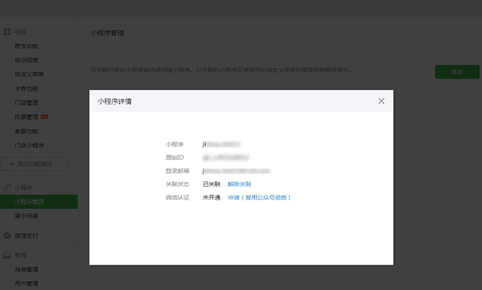前往微信公眾平臺(tái)(mp.weixin.qq.com)登錄公眾號(hào)->小程序->小程序管理->已關(guān)聯(lián)小程序->詳情-申請(qǐng)
